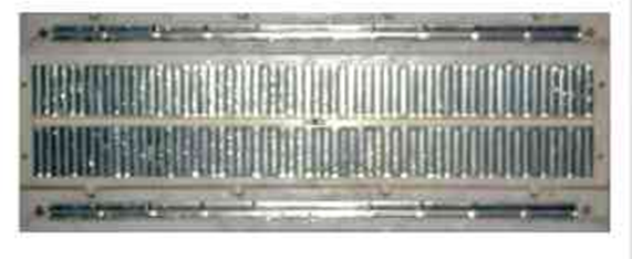 ניתן לראות את פסי המתכת הרבים (אנכים) ועוד שני פסים ארוכים בחלק העליון והתחתון.