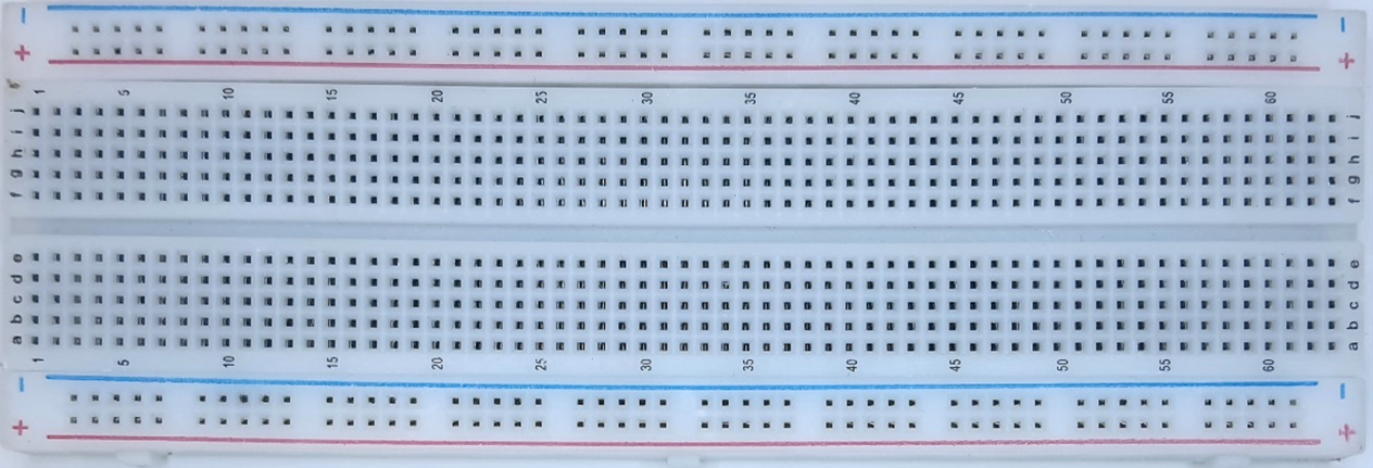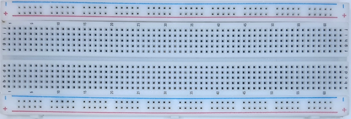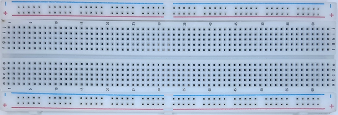 בתמונה הבאה ניתן לראות את החלק העליון של המטריצה בו מכניסים את החוטים (מוליכים) והרכיבים. כל פס מתכת אנכי מהווה צומת של 5 חוטים (או הדקי רכיבים). הפסים העליונים והתחתונים משמשים בדרך כלל להעברת מתח והאדמה מהסוללה או מקור המתח בו משתמשים.