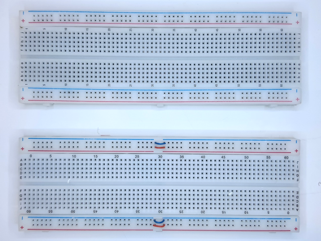 חשוב לדעת – אם תרצו להשתמש במטריצה כמו בתמונה האחרונה בה הפסים מחולקים ל 2, אבל שכל שני פסים ישמשו כפס מתחים אחד, תוכלו לחבר חוט בין קצוות כל פס מתחים וכך לקבל פס מתחים אחד כמו בתמונה הבאה .המטריצה העליונה עם פס הולכת מתח רצוף לכל האורך. המטריצה התחתונה עם פס הולכת מתח חצוי לשניים אך עם חוטים מגשרים היוצרים רצף בין שני פסי המתח (כל אחד מהארבעה בנפרד):